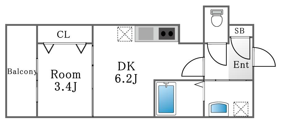 - 間取り:1DK(DK6.2帖 × 洋室3.4帖)