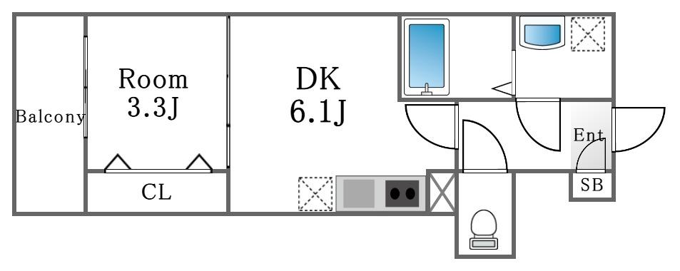 - 間取り:1DK(DK6.1帖 × 洋室3.3帖)